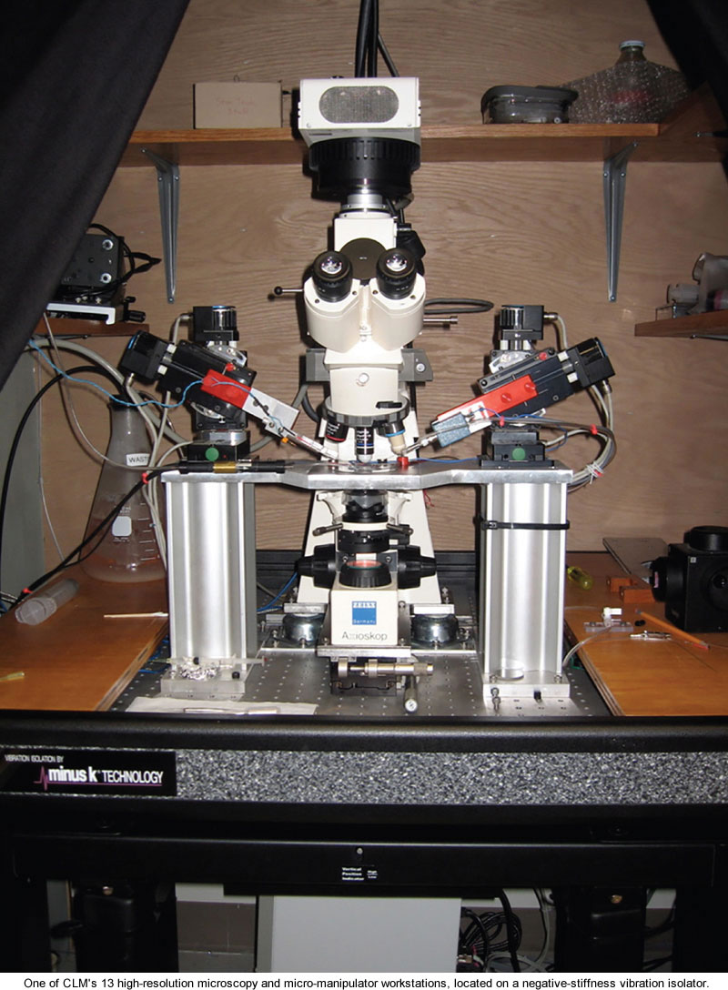 The CLM team also tested an active electronic force cancellation workstation, but chose the negative-stiffness systems because of their superior performance. Thirteen negative-stiffness Model MK26 workstations were installed in the CLM laboratory to support both the microscopes and the micro-manipulators.