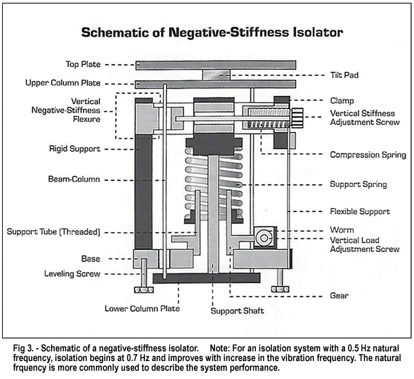 Negative-stiffness isolators achieve a high level of isolation in multiple directions. These isolators have the flexibility of custom tailoring resonant frequencies to 0.5 Hz vertically and horizontally (with some versions at 1.5 Hz horizontally; see Figure 3).